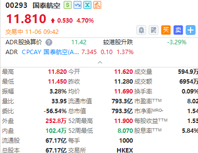 华盛资讯11月06日讯,港股国泰航空盘初持续走高,截至发稿,涨近5%;消息面上,国泰航空在港交所公告中表示,将以69.7亿港元(8.96亿美元)回购卡塔尔航空持有的9.57%的股份。该交易须获不少于75%的股东同意。