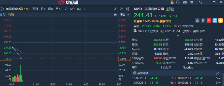 半导体板块多股走弱,AMD $AMD 跌近6%,高通、英特尔跌近2%。