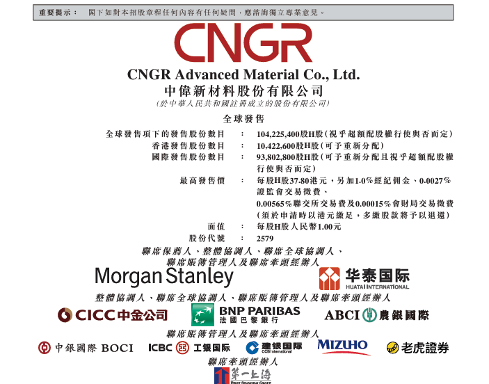 中伟新材(02579)于2025年11月7日至11月12日招股,该公司拟全球发售1.04亿股,其中香港发售占10%,国际发售占90%,另有15%超额配股权,每股发售价34-37.8港元。每手200股,预期股份将于2025年11月17日在联交所开始买卖。