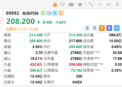 华盛资讯11月07日讯,泡泡玛特大跌超4%,股价创近5个月新低;直播事故”冲上热搜,工作人员称79元盲盒贵但有人买单。