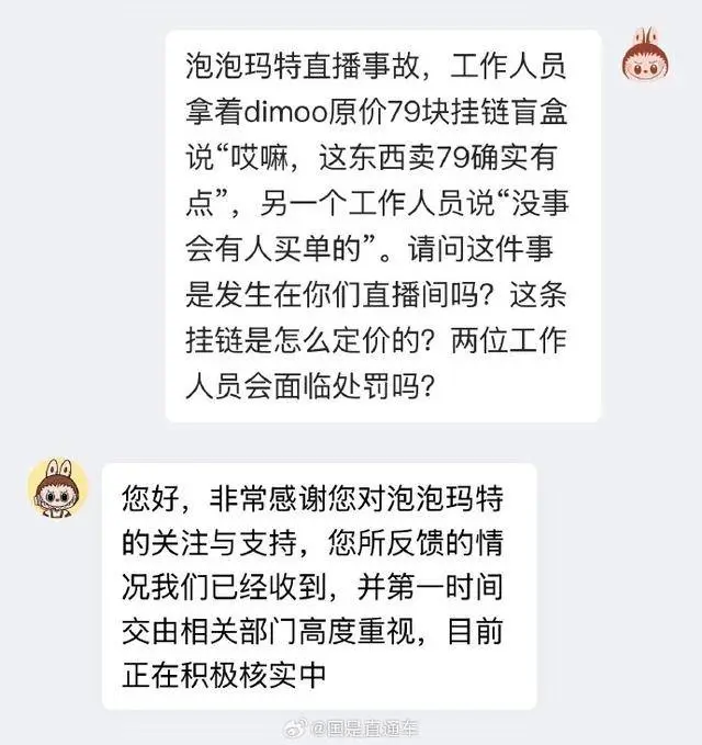 对此,泡泡玛特官方客服表示,关于前一晚直播间直播事故已经对相关的工作人员在进行内部处理,会进行核实。而对于所提到的79元的商品价格是否会调整,客服表示暂没收到通知。