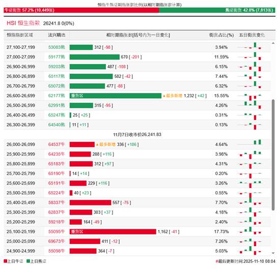 过去5日,恒指牛证合计约9666万港元资金净流入;恒指熊证则合计约1.45亿港元资金净流出套现。街货分布方面,至上周五,恒指牛证街货占比约57.2%,分布在收回价25100点至26100点之间,累计相当约3405张期指合约;恒指熊证街货在收回价26300点至26700点之间,累计相当约1583张期指合约。