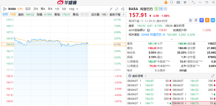 中概股盘前普涨,阿里巴巴盘前涨超4%,哔哩哔哩、京东业绩超预期,盘前股价均张超2%。