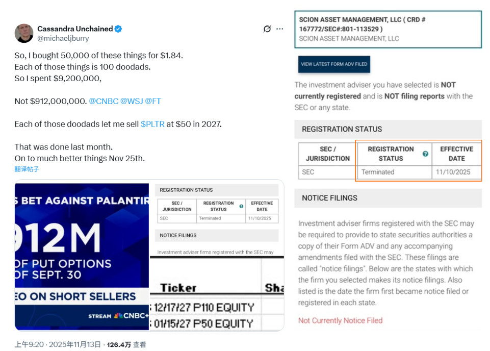 因公开挑战美股AI龙头估值成为市场焦点的Michael Burry,在数小时前宣布他管理的Scion基金已经从美国证券交易委员会撤销注册。Burry似乎对媒体报道他“十亿美元做空”的角度非常不满,索性公布了部分做空的细节。