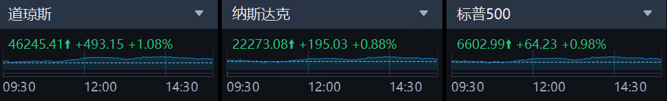 美东时间周五,三大指数集体收涨,道指涨幅最大,上涨约1.1%。截至收盘,道琼斯指数涨1.08%,报46,245.41点;标普500指数涨0.98%,报6,602.99点;纳斯达克指数涨0.88%,报22,273.08点。