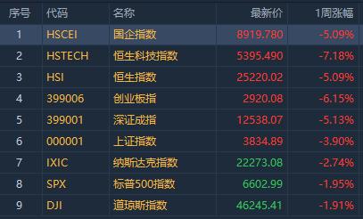 美股方面,本周道琼斯指数跌1.91%,报46245.41点;纳斯达克指数跌2.74%,报22273.08点;标普500指数跌1.95%,报6602.99点。