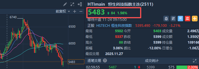 美联储“三把手”、纽约联储主席威廉姆斯释放出更鸽派的信号。他在智利发表讲话时表示,随着劳动力市场出现更多下行风险、通胀上行压力减弱,他认为近期还有进一步降息的“空间”。威廉姆斯指出,目前货币政策处于“温和限制性”状态,但较过去几个月已不那么紧缩,因此适度调整利率区间可以让政策更接近“中性水平”。他强调,美联储需要确保在将通胀重新拉回2%目标的同时,不会对就业造成过度损害。威廉姆斯表示,关税对整体通胀贡献约为0.5至0.75个百分点,但尚未看到其引发二轮通胀效应。他预计通胀要到2027年才能重新回到2%的目标水平,并认为财政政策将在明年为经济增长带来一定支撑,但移民与关税政策可能带来相反的压力。恒指期货、恒生科技指数期货均反弹超1%。