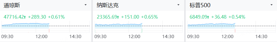 美国股市逢感恩节次日提早三小时收盘,三大指数连续第五个交易日上涨。截至收盘,道琼斯指数涨0.61%,报47716.42点;标普500指数涨0.54%,报6849.09点;纳斯达克综合指数涨0.65%,报23365.69点。