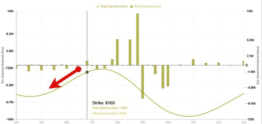 而根据SpotGamma的数据,Strategy面临着典型的“过度杠杆化目标遭受攻击”的局面。大量看跌期权聚集在170美元下方。这种负Gamma效应意味着,如果比特币价格进一步下跌,做市商的对冲行为可能会加速MSTR、Coinbase等加密概念股的下跌,甚至拖累美股。