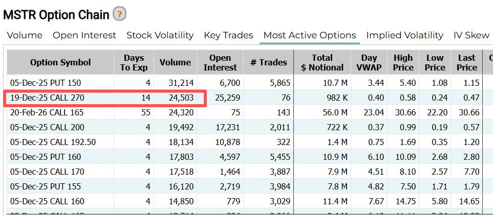 期权方面,Strategy昨日的认购成交颇有看点。其中一份12月19日到期的CALL,成交量高居第二位,行权价格达270美元,较现价有近60%的涨幅空间。