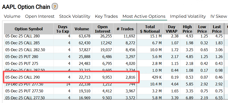期权方面,苹果昨日成交量排名前三的合约都是CALL,此外,一张本周五(12月5日)到期的认购合约,行权价达290美元。