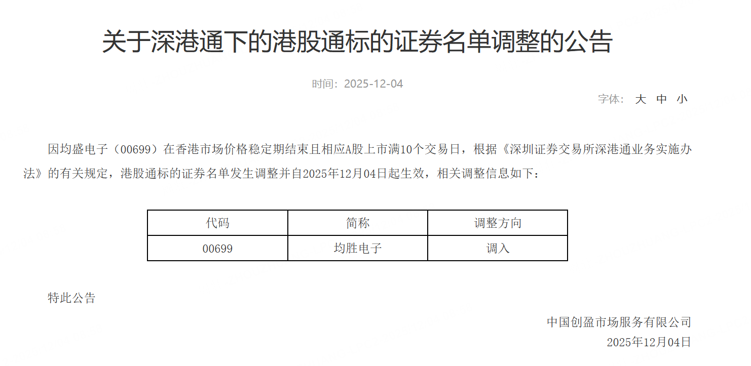 12月4日,深交所发布公告,因均胜电子在香港市场价格稳定期结束且相应A股上市满10个交易日,根据《深圳证券交易所深港通业务实施办法》的有关规定,港股通标的证券名单发生调整并自2025年12月04日起生效。