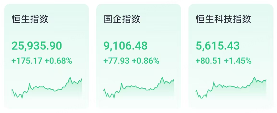 12月4日周四,港股三大指数齐涨。恒生科技指数一度涨至2%,最终收涨1.45%重回5600点上方,恒生指数涨0.68%报25935.90点,国企指数涨0.86%报9106.48点。