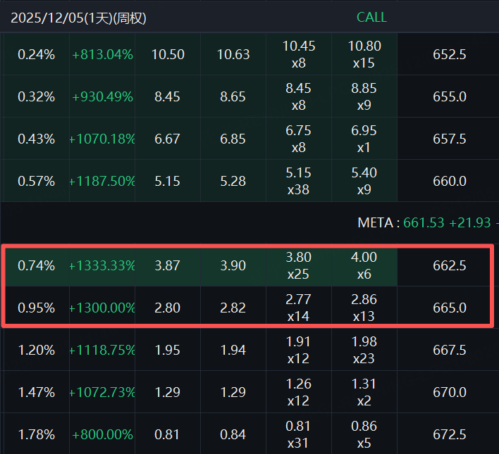 Meta的涨幅虽然不算很高,但CALL的表现却非常强劲,多张合约出现10倍以上的涨幅。其中两张周五到期合约的价格飙升1300%。