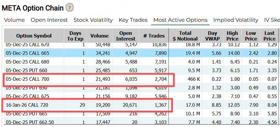期权方面,Meta一张本周五到期的认购合约行权价为700美元,一张明年1月16日到期的认购合约行权价为720美元。