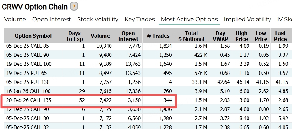 期权方面,CoreWeave一张明年2月到期的认购合约,行权价达135美元,较现价有近60%的涨幅空间。