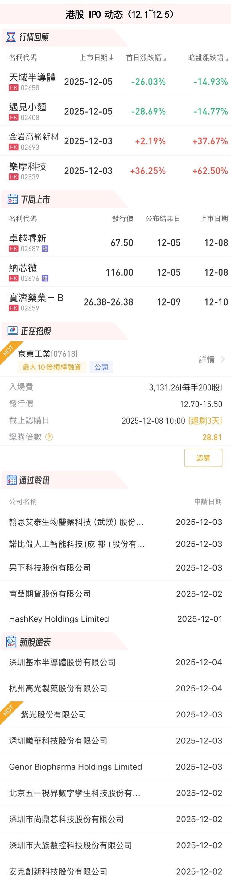 华盛资讯12月5日消息,年末港股IPO市场热度回暖,本周“京东系”第六家上市公司京东工业正在招股中;4只新股于本周上市,其中乐摩科技首日大涨36%;此外,纳芯微、卓越睿新本周完成招股,将于下周一上市。