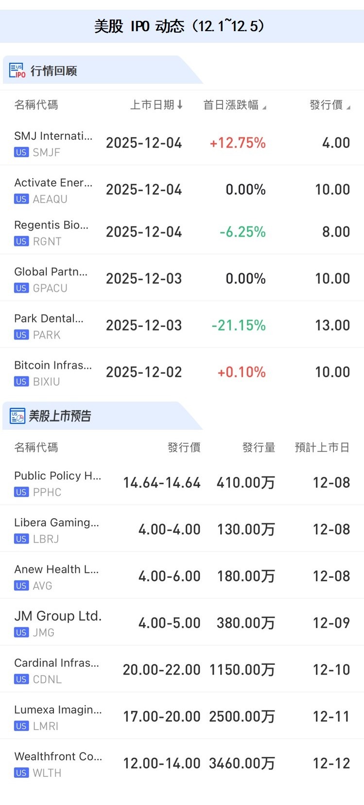 美股方面,本周9只新股上市,其中新加坡地板和地板分销公司 $SMJF 上市首日收涨12.75%。