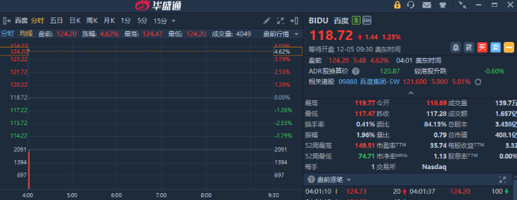 华盛资讯12月5日讯,多只热门中概股盘前走强,百度大涨近5%,消息面上,旗下 AI 芯片子公司昆仑芯被曝计划赴港IPO,估值近30亿美元。