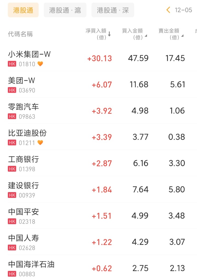 小米集团-W、美团-W 、零跑汽车分别获净买入30.13亿港元、6.07亿港元、3.92亿港元;