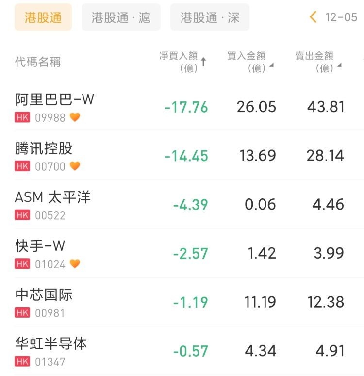 阿里巴巴-W、腾讯控股、ASMPT分别遭净卖出17.76亿港元、14.45亿港元、4.39亿港元。