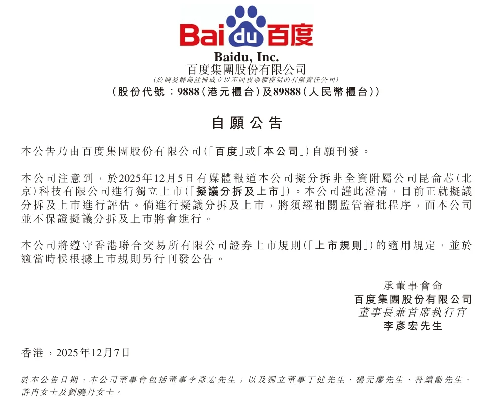 12月7日晚间,百度发布公告,就市场关于公司拟分拆非全资附属公司昆仑芯(北京)科技有限公司进行独立上市传闻作出澄清。公告表示,目前正就拟议分拆及上市进行评估。倘进行拟议分拆及上市,将须经相关监管审批程序,而公司并不保证拟议分拆及上市将会进行。