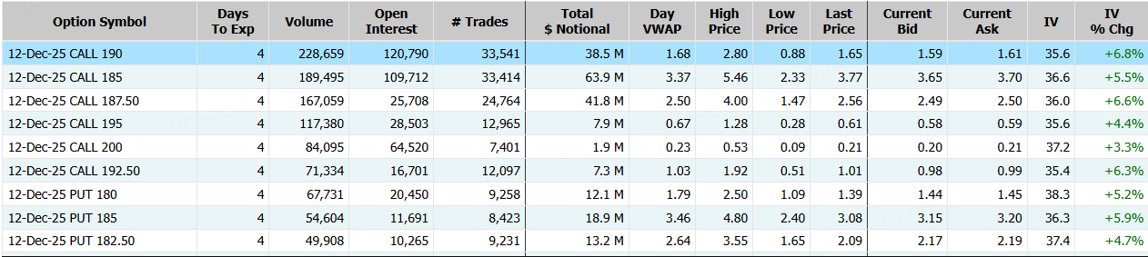 英伟达隔夜收涨近2%,盘后续涨2%。期权合约成交249.22万张,12月12日到期的190美元的行权看涨期权交易量特别高,共有228,65份合约交易。 $NVDA 20251212 190.0 CALL$