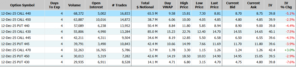 特斯拉隔夜跌超3%,期权合约成交167.17万张,12月12日到期的440美元的行权看涨期权交易量特别高,共有68,372份合约交易。 $TSLA 20251212 440.0 CALL$