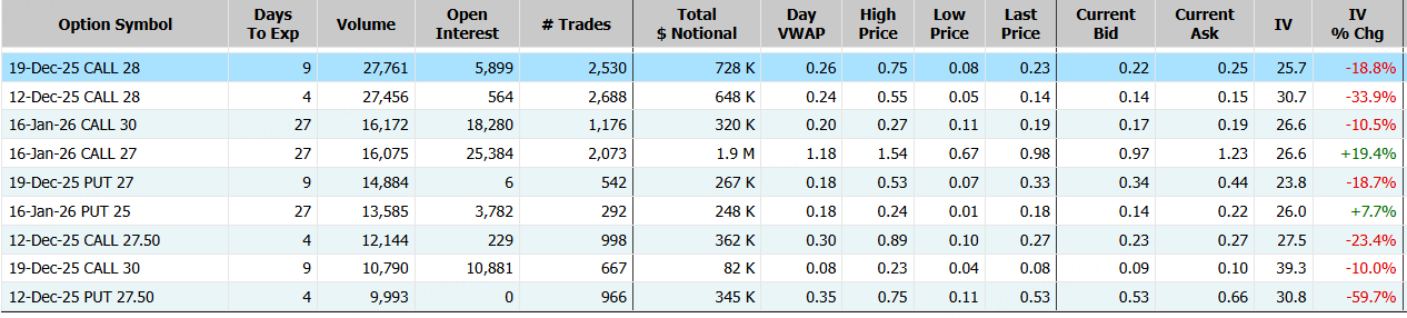华纳兄弟的期权合约成交量达到了44.40万张,较90日均量放大了3.9倍。12月19日到期的28美元的行权看涨期权交易量特别高,共有27,761份合约交易。 $WBD 20251219 28.0 CALL$