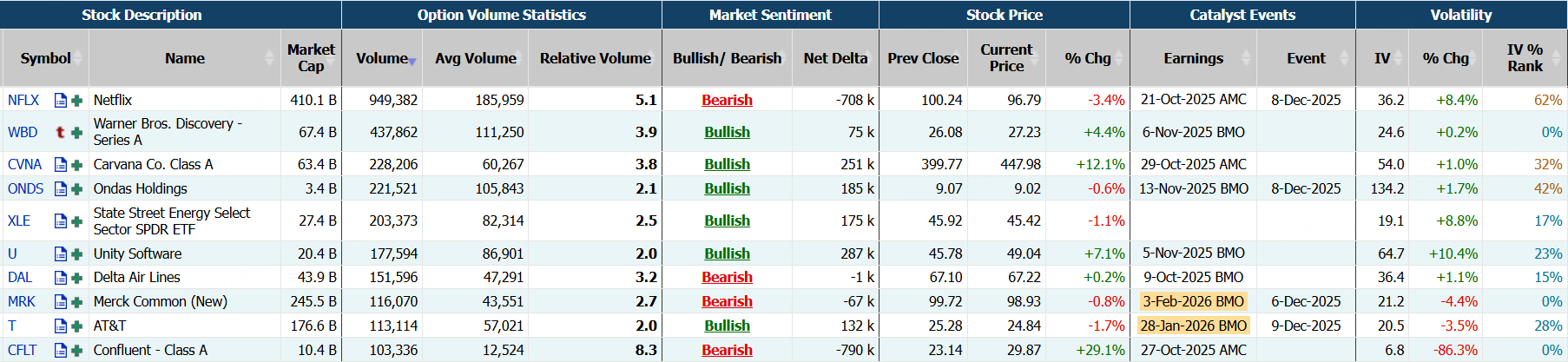 期权交易方面,奈飞的期权合约成交量达到了95.20万张,较90日均量放大了5.1倍。12月12日到期的100美元的行权看涨期权交易量特别高,共有33,906份合约交易。 $NFLX 20251212 100.0 CALL$