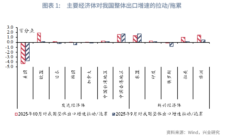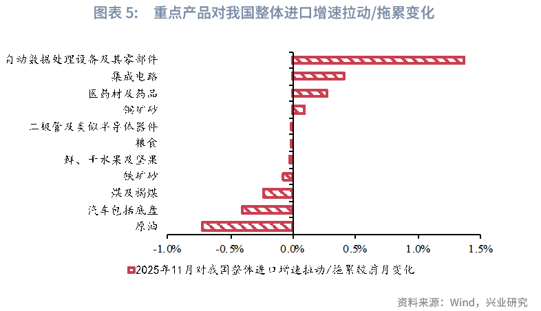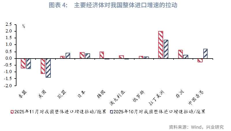 “芬太尼关税”下降对中美贸易的影响尚未在11月显现。11月我国对美出口增速录得-28.6%,对出口的拖累较上月扩大0.5个百分点至4.3%。对美出口降幅的扩大可能一方面由于去年同期“抢出口”带来的高基数,另一方面美国年末消费旺季的发货时点已过,“芬太尼关税”下降的效应可能将更多地在2026年体现。