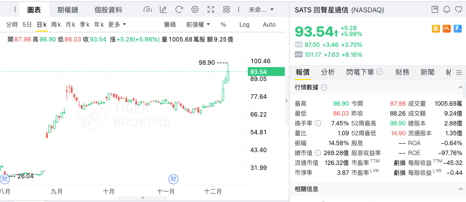 值得一提的是,持有SpaceX股票的 回声星通信 ,在今年9月时所持股份估值达85亿美元。受上述消息提振,该公司股价周二盘后大涨10美元,最终收于93.54美元,单日涨幅达6%,过去一周累计涨幅更是高达25%。