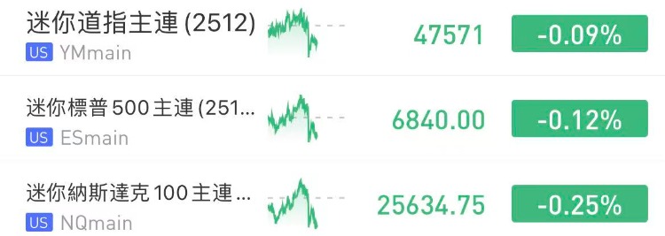 美股三大指数期货盘前小幅下跌,纳指期货 $NQmain 跌0.25%,标普500期货 $ESmain 跌0.12%,道指期货 $YMmain 跌0.09%。