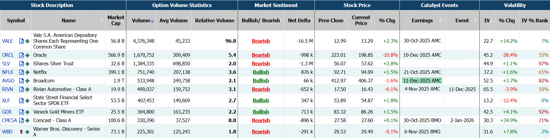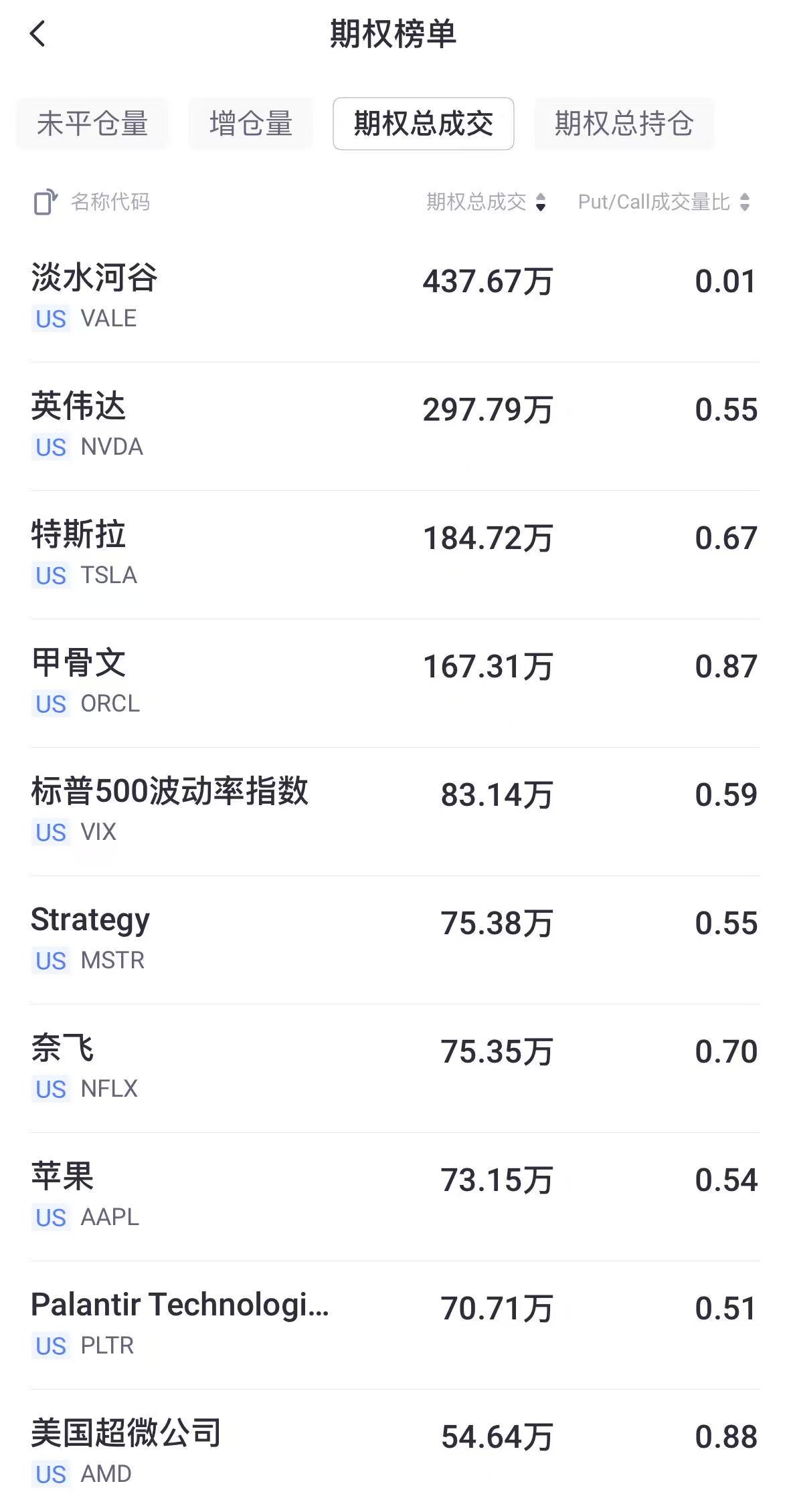 美国电动汽车公司Rivian Automotive隔夜跌超6%,期权合约成交49.9万张,较90日均量放大3.1倍。12月12日到期的17美元的行权看涨期权交易量特别高,共有35,661份合约交易。 $RIVN 20251212 17.0 CALL$