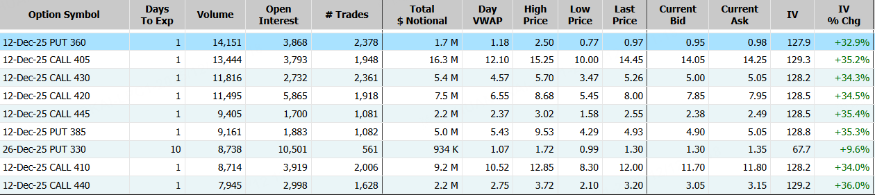 博通隔夜下跌1.6%,盘后续跌超4%。期权合约成交53.4万张,较90日均量放大2.1倍。12月12日到期的360美元的行权看跌期权交易量特别高,共有14,151份合约交易。 $AVGO 20251212 360.0 PUT$