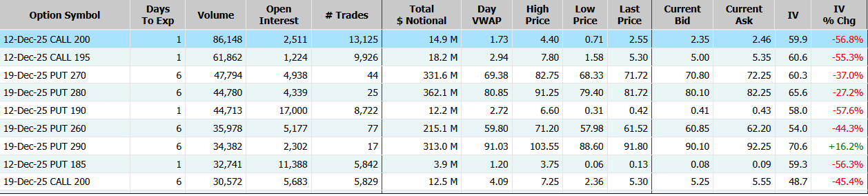 甲骨文隔夜跌近11%,期权合约成交167.31万张,较90日均量放大5.4倍。12月12日到期的200美元的行权看涨期权交易量特别高,共有86,148份合约交易。 $ORCL 20251212 200.0 CALL$