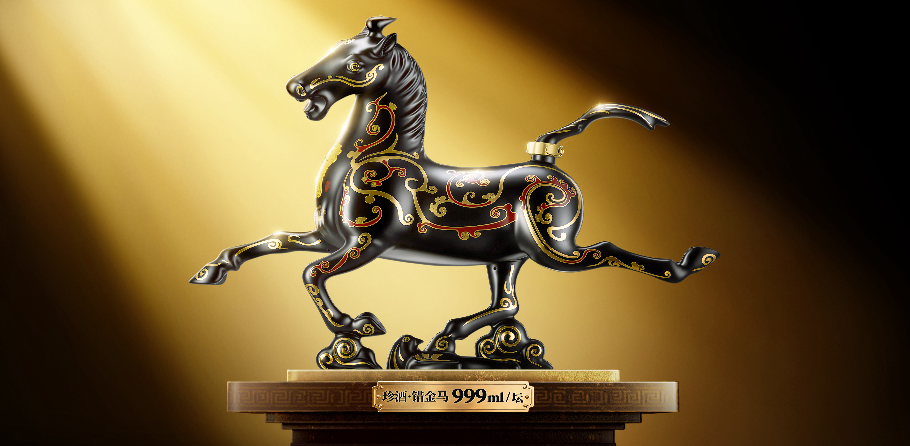 国瓷工艺致敬器型之美。“珍酒·错金马”采用国瓷工艺,由资深陶瓷匠人手工打造,历经粗型、精雕、釉质等数十道工序打磨,生动再现“铜奔马”三足腾空、一足踏燕的奔腾姿态。马身以深邃玄黑为底,象征沉稳与积淀;红金双色卷云纹沿马颈、躯干蜿蜒铺陈,层次分明,呈现出吉祥流转、一往无前的视觉美感。