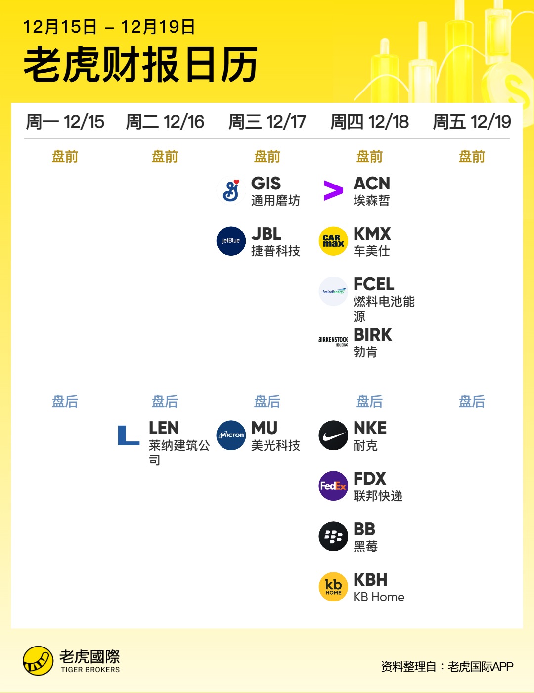 财报方面, 埃森哲、勃肯、车美仕、燃料电池能源(盘前),耐克、联邦快递、黑莓、KB Home(盘后)发布财报。