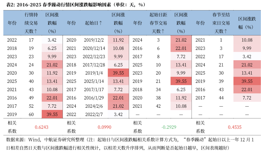 进一步看,历年“春季躁动”持续时间越长,区间表现往往越好,二者相关性系数0.62。行情起始日的公历日期早晚与区间表现几乎没有相关性。但若以农历日期来看,结束日距春节日期越晚,区间涨跌幅往往越好,二者相关系数0.45。