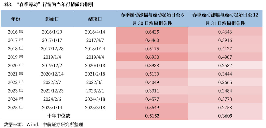 经过前一年末的方向切换和蓄力等待,12月中央经济工作会议后至两会前,市场通过政策吹风挖掘线索,识别可能的政策发力方向,资金选择在春季提前布局半年甚至全年主线,进而形成了这一阶段的“春季躁动”行情。复盘显示,“春季躁动”行情期间表现对于全年主线有一定指引和前瞻性,其中对上半年的指引效果更为显著。通过2016年至2025十年间A股个股“春季躁动”行情期间涨跌幅与“春季躁动”起始日至6月30日涨跌幅相关系数、个股“春季躁动”行情期间涨幅与“春季躁动”起始日至12月31日涨幅相关系数,观察“春季躁动”对于当年上半年行情和全年行情的指引。我们发现过去全部十年春季躁动对上半年行情做出较强的正向指引,相关系数中位数达0.5152,历年相关系数均超过0.3,其中6年超过0.5。过去全部十年春季躁动对全年行情也做出一定正向指引,但其程度均弱于对于上半年的作用,相关系数中位数达0.3609。