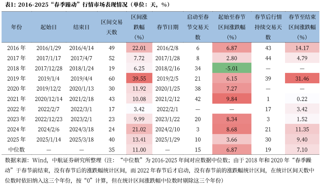 近期市场对于“春季躁动”议论较多。我们统计了2016年至2025年过去十年的A股“春季躁动”行情,根据万得全A日K线图寻找前一年12月至本年度春季内的一段趋势性上涨区间,以区间最低点的下一个交易日为行情起始日,区间最高点为结束日。