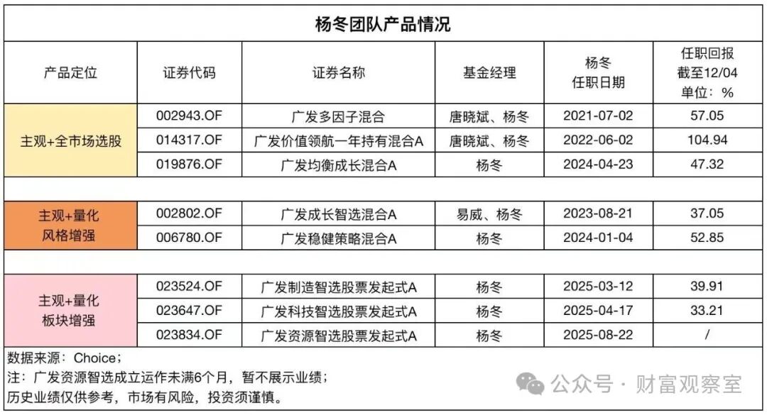 在团队内部,杨冬建立了专业分工、优势叠加的协作机制。杨冬本人负责宏观策略和风格研判,还配备了科技、周期等方向的行业研究员,以及专门负责基本面量化和AI增强的量化研究员。