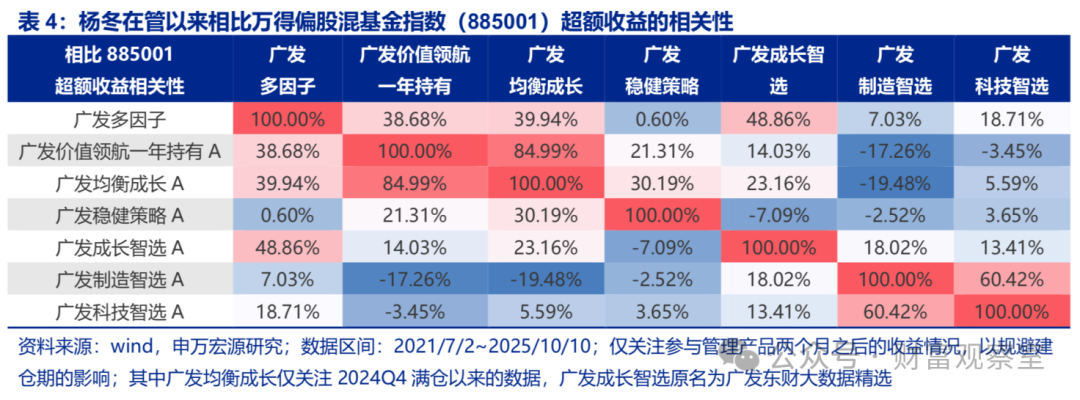 根据申万宏源的研究,杨冬在管产品相对偏股基金指数的超额收益相关性普遍低于50%,这种低相关性进一步增强了整体组合的稳定性。以杨冬管理的广发稳健策略为例,该产品采用“主观多头+主动量化+AI增强”的多策略融合模式,在红利风格基础上进行增强。