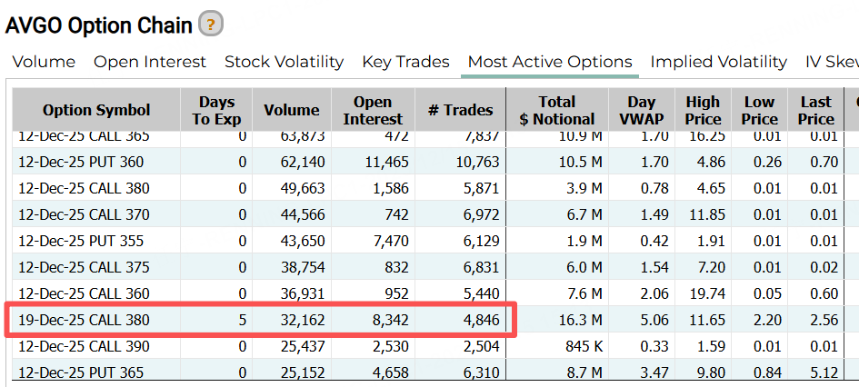 期权方面,博通上周五前十大成交中,一张12月19日到期的认购合约,行权价380美元。