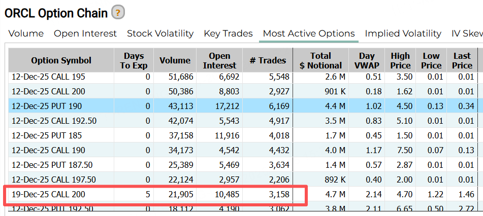 期权方面,甲骨文上周五的前十大成交中,一张12月19日到期的认购合约,行权价为200美元。