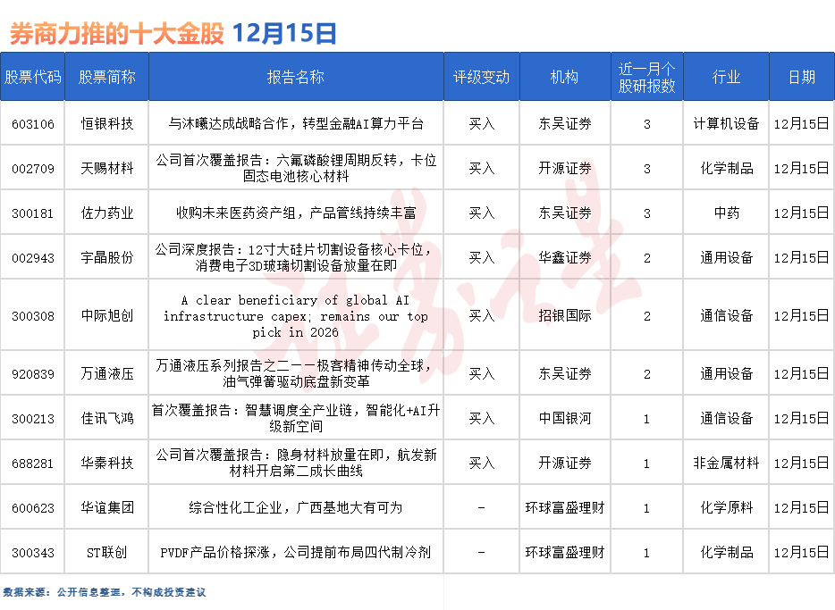 恒银科技最受券商关注,近一个月获东吴证券、中邮证券等3份券商研报关注,位居12月15日券商力推股榜首。