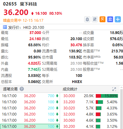 华盛资讯12月15日讯,果下科技正在暗盘交易中,截至发稿涨超80%,中签一手账面浮盈1610港元,最新总市值超183亿港元。该股预计将于12月16日正式挂牌上市,配售结果将于今日晚间披露。