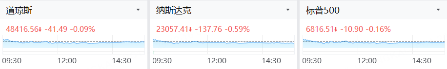 美东时间周一,美股三大指数悉数收跌。截至收盘,道琼斯指数跌0.09%,报48,416.56点;标普500指数跌0.16%,报6,816.51 点;纳斯达克指数跌0.59%,报23,057.41点。