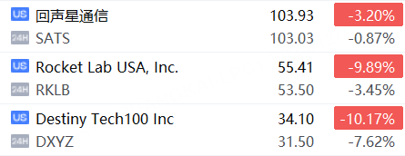 12月16日,美股夜盘时段,太空概念股下跌,Destiny Tech100跌超7%,Rocket Lab跌超3%,回声星通信跌近1%;
