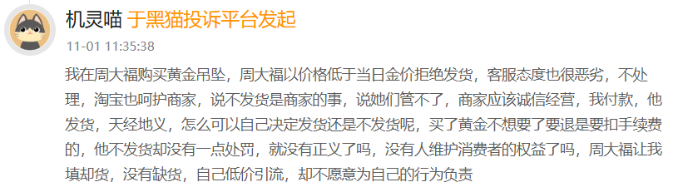 也需要看到,黄金作为高价值、重体验的商品,线上无法提供实体店的直观质感与专业服务,这尤其会抑制高附加值“一口价”产品的销售,可能使线上渠道沦为消费者的比价工具,削弱品牌溢价能力;同时,由于线上定价需紧跟实时金价,但在金价快速单边上涨时,从接单到采购补货的时间差极易导致“售出即亏损”,直接侵蚀利润。此前已有消费者在投诉平台反映,其在周大福购买黄金吊坠,周大福以价格低于当日金价拒绝发货,这凸显了价格波动带来的履约纠纷。